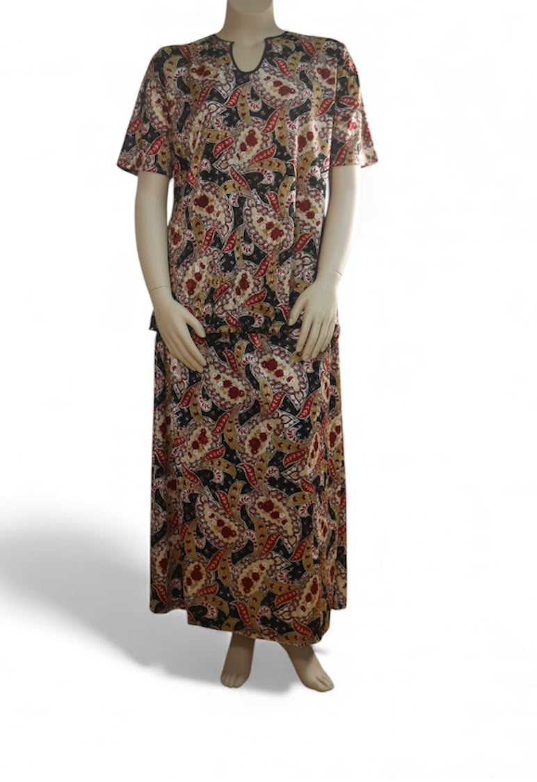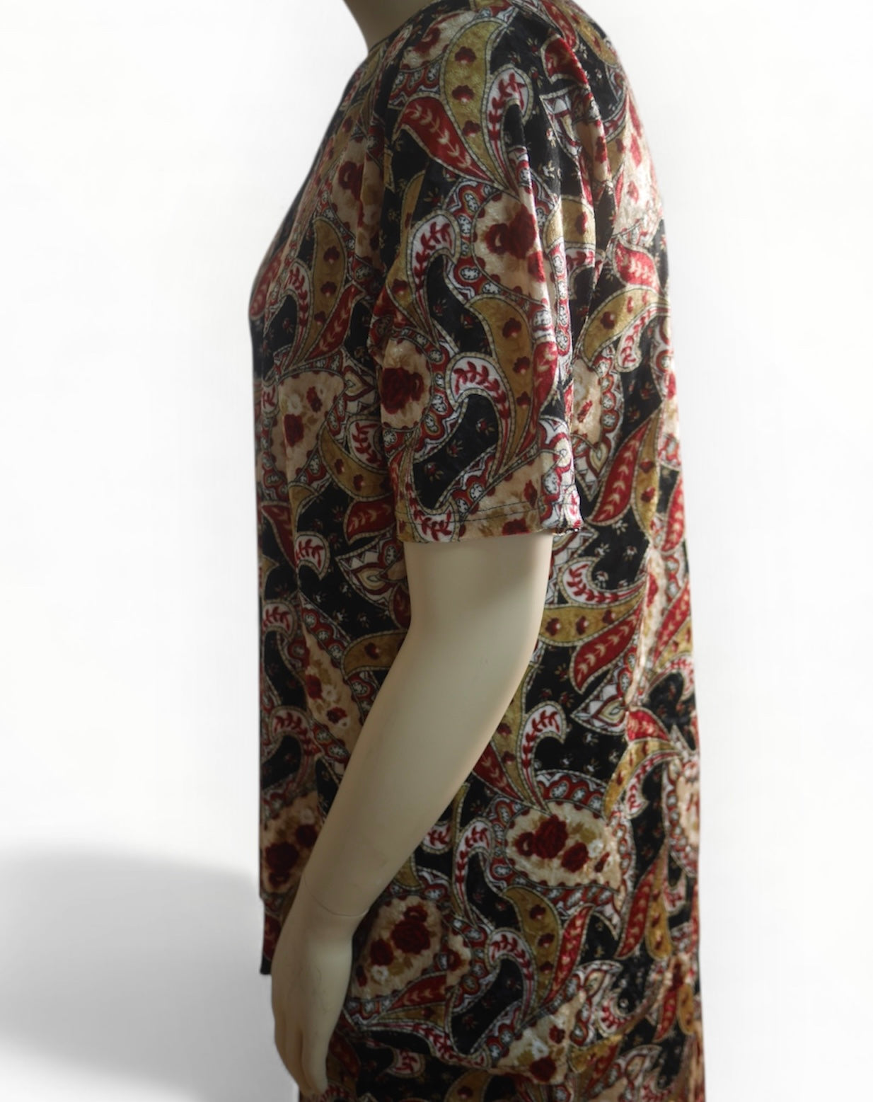 The style stays simple with the stand out print speaking volumes on colours and design. A small bounded V-neck and short sleeved top.